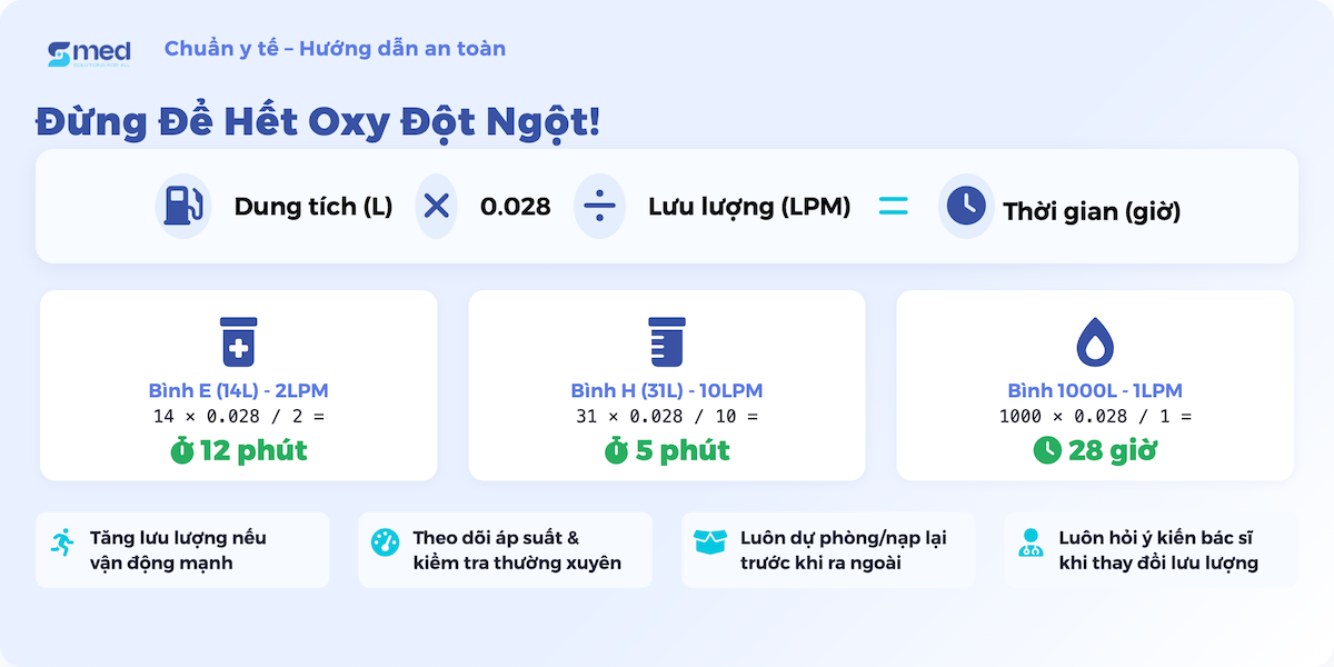 Thời gian sử dụng (giờ) = (Dung tích bình (lít) × Hệ số cố định) / Lưu lượng oxy (LPM)