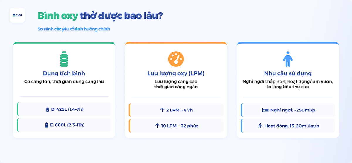 Lưu lượng oxy càng cao thì thời gian sử dụng bình càng ngắn, điều này đặc biệt quan trọng khi quản lý liệu pháp oxy cho bệnh nhân mắc các bệnh hô hấp mãn tính hoặc trong các tình huống y tế khẩn cấp.