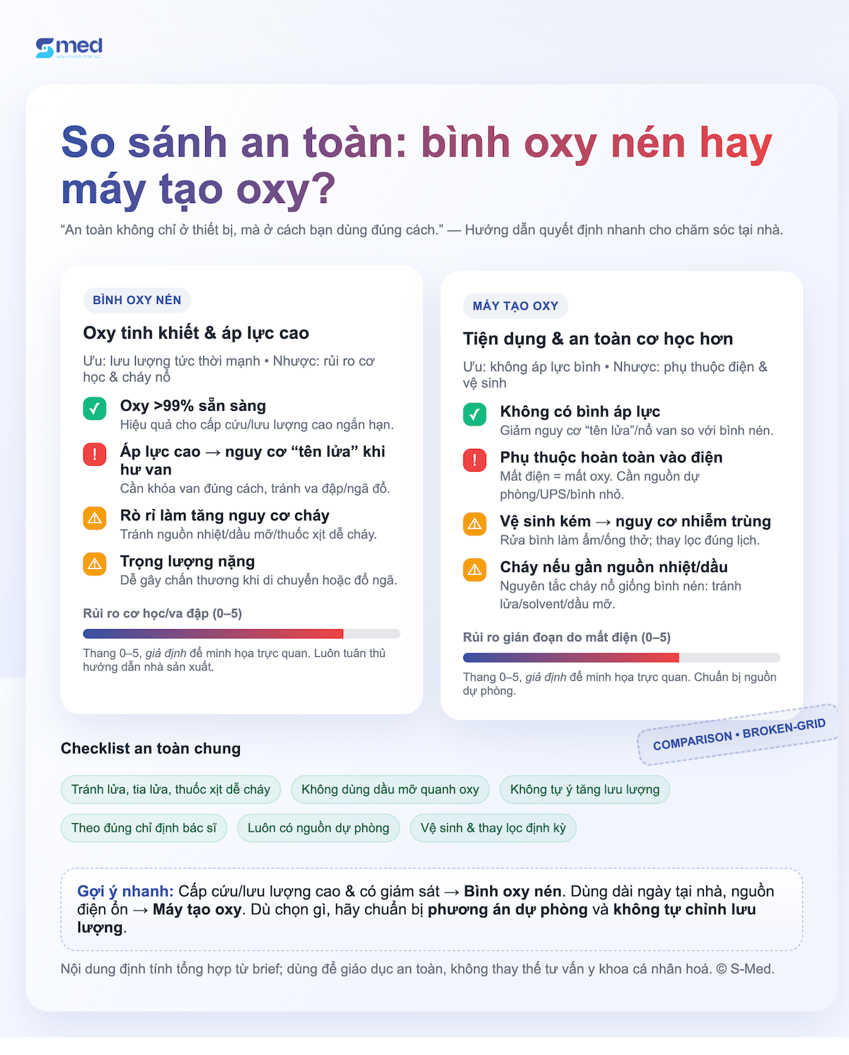 Cả bình oxy nén và máy tạo oxy đều tiềm ẩn nguy cơ nếu dùng sai cách, nhưng mức độ và dạng rủi ro là khác nhau.