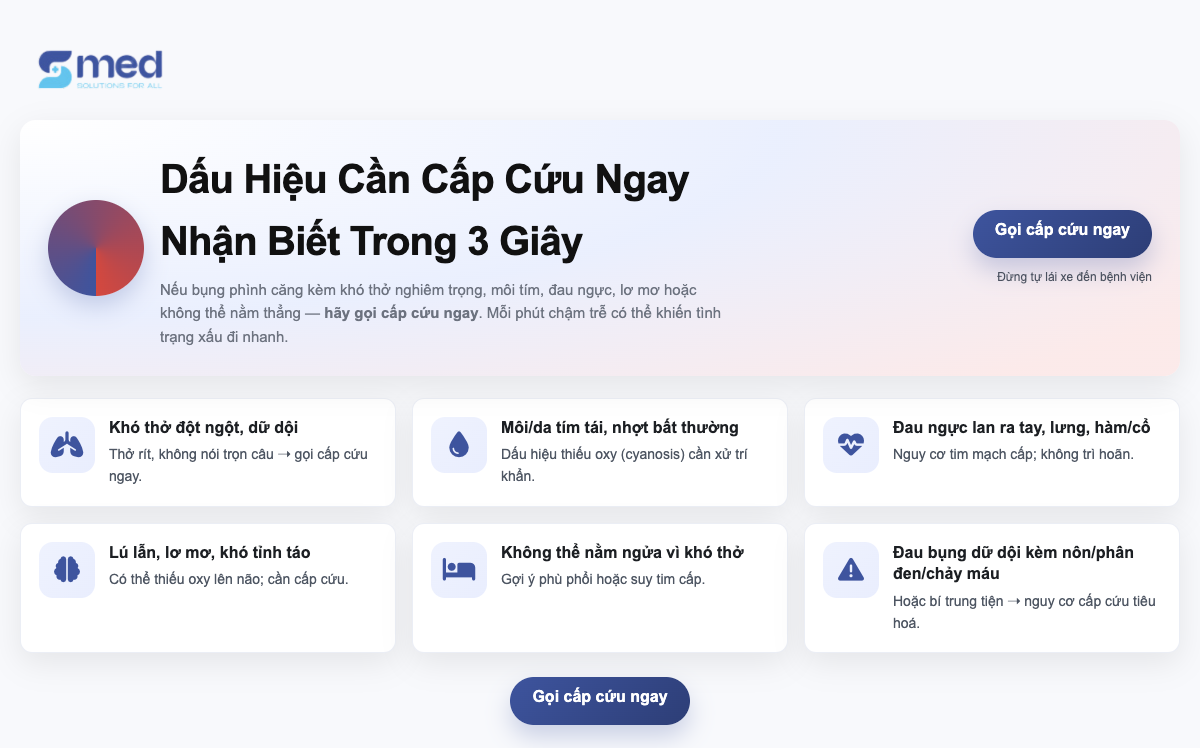 Nếu bạn bị bụng phình căng kèm theo khó thở nghiêm trọng hoặc các dấu hiệu như môi tím, đau ngực, lơ mơ, hoặc không thể nằm thẳng – hãy gọi cấp cứu ngay lập tức.