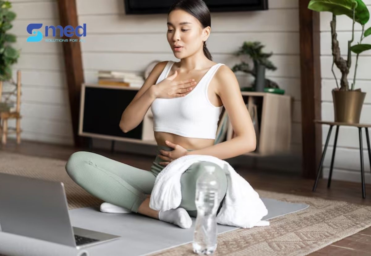 Thực hành thở bằng bụng: đặt một tay lên ngực, một tay lên bụng, hít vào bằng mũi sao cho bụng phình lên nhẹ, rồi thở ra từ từ bằng miệng (chúm môi). Bạn có thể áp dụng trong 5–10 phút hoặc sau bữa ăn. Kỹ thuật này làm dịu hơi thở và giảm cảm giác khó chịu.