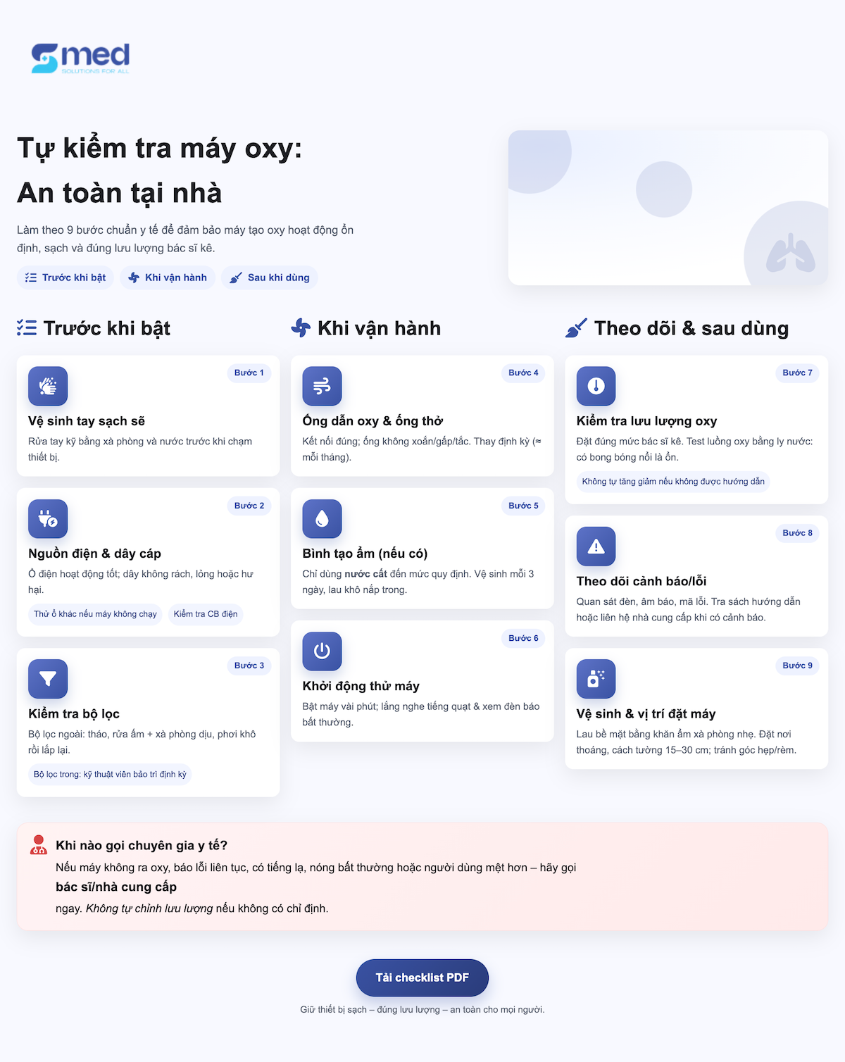 Dù bạn là người bệnh hay người chăm sóc, hiểu cách kiểm tra máy tạo oxy đúng cách không chỉ là kỹ năng – mà còn là hành động của tình thương và trách nhiệm. Đừng đợi đến lúc có sự cố mới thấy mình lúng túng. Chỉ vài phút kiểm tra mỗi ngày có thể mang lại sự an toàn suốt hành trình điều trị. Hãy để S-med đồng hành cùng bạn với các thiết bị và hướng dẫn đạt chuẩn y tế tại s-med.vn – nơi bạn có thể tin tưởng để chăm sóc hơi thở của người thân.
