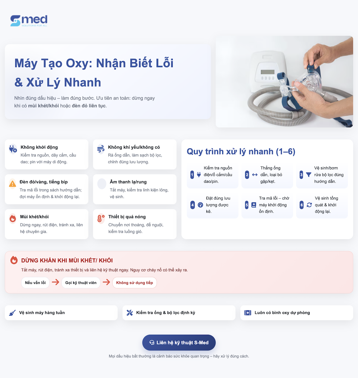 Nếu máy không ra oxy, liên tục báo lỗi, có tiếng lạ, nóng bất thường hoặc người dùng có dấu hiệu mệt hơn, hãy gọi bác sĩ/người cung cấp ngay. Đặc biệt không tự điều chỉnh lưu lượng nếu không có chỉ định.