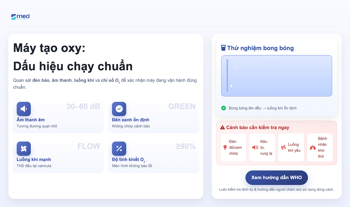 Để kiểm tra máy tạo oxy có hoạt động đúng chuẩn hay không, bạn cần quan sát âm thanh, đèn báo, luồng khí, và chỉ số hiển thị trên máy theo tiêu chuẩn y tế. Các tín hiệu như đèn xanh ổn định, âm thanh êm ái và luồng khí mạnh mẽ là dấu hiệu cho thấy máy đang hoạt động tốt.