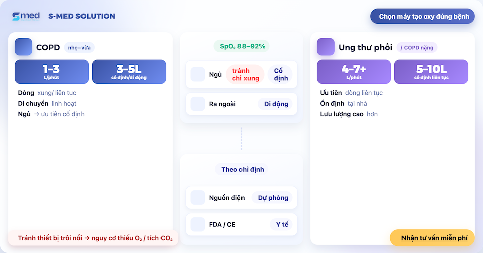 Đối với bệnh nhân COPD nhẹ-vừa phải, máy 3L–5L (cố định hoặc di động) có thể đủ nếu bác sĩ chỉ định 1–3 L/phút. Trường hợp COPD nặng hay ung thư phổi tiến triển, bệnh nhân thường cần 4–7 L/phút hoặc hơn, nên ưu tiên máy cố định 5L–10L có dòng chảy liên tục để duy trì SpO₂ 88–92%.