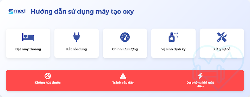 Ghi nhớ: không hút thuốc gần máy, tránh vấp dây dẫn, chuẩn bị sẵn oxy dự phòng khi mất điện. Luôn đọc kỹ hướng dẫn sử dụng và hỏi bác sĩ khi cần.