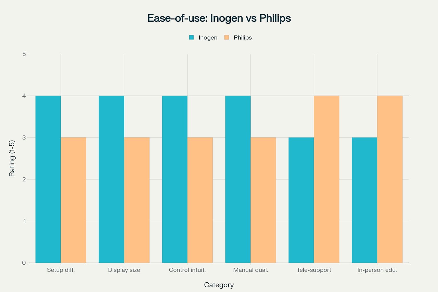 Inogen thường dễ sử dụng hơn Philips cho người già và người chăm sóc nhờ quy trình lắp đặt nhanh gọn, màn hình rõ nét và nút bấm lớn dễ thao tác.