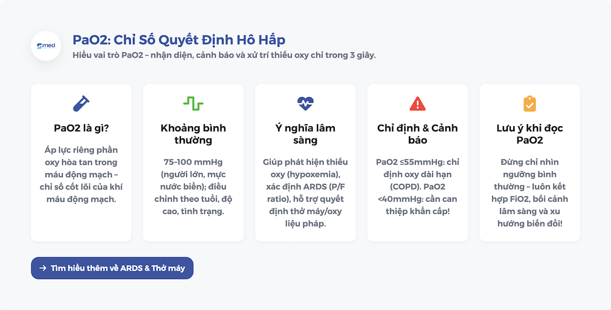 Quan trọng hơn, PaO2 không chỉ là một con số – nó là chỉ dấu để xác định mức độ thiếu oxy (hypoxemia), hỗ trợ chẩn đoán ARDS qua tỷ số PaO2/FiO2 (P/F), và giúp quyết định phương pháp hỗ trợ thở phù hợp trong cấp cứu và chăm sóc bệnh nhân mãn tính.