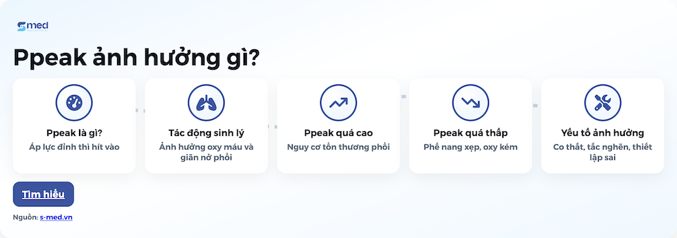 Tác động sinh lý: Ppeak ảnh hưởng đến oxy hóa máu và độ giãn nở phổi. Mức Ppeak cao có thể tăng thể tích phổi, cải thiện tuyển mộ phế nang nhưng cũng tăng nguy cơ tổn thương phổi. Ngược lại, Ppeak thấp có thể dẫn đến thông khí kém hiệu quả, giảm dung tích cặn chức năng.