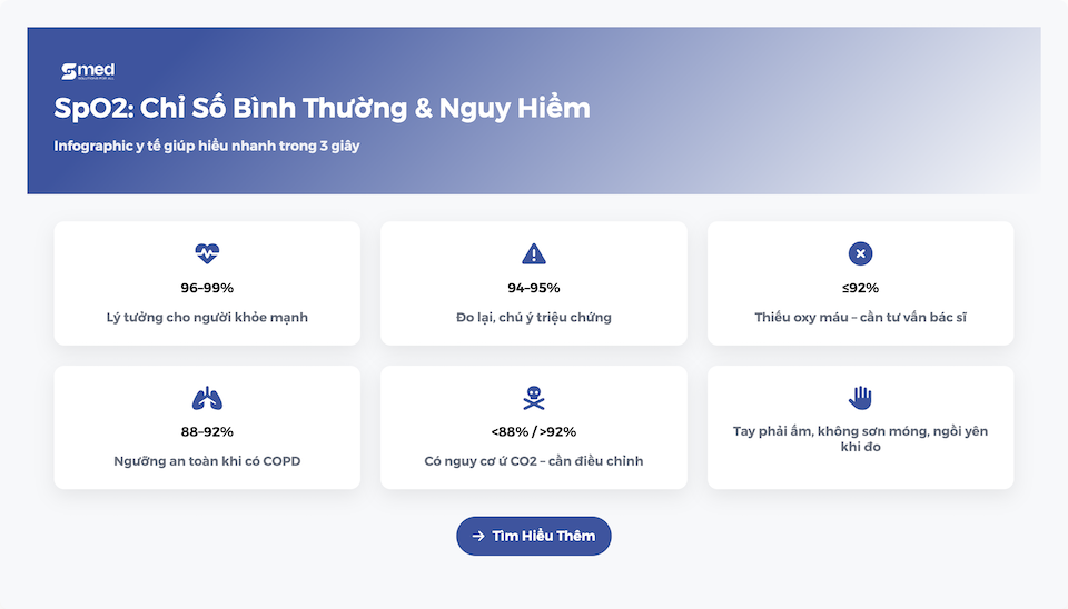 Lưu ý: Không chỉ nhìn vào con số — hãy quan sát triệu chứng và diễn biến. Chỉ số máy SpO2 có thể sai lệch nếu tay lạnh, cử động hoặc đo chưa đúng cách. Khi nghi ngờ, hãy đo lại sau vài phút, hoặc liên hệ chuyên gia y tế khi chỉ số không cải thiện.