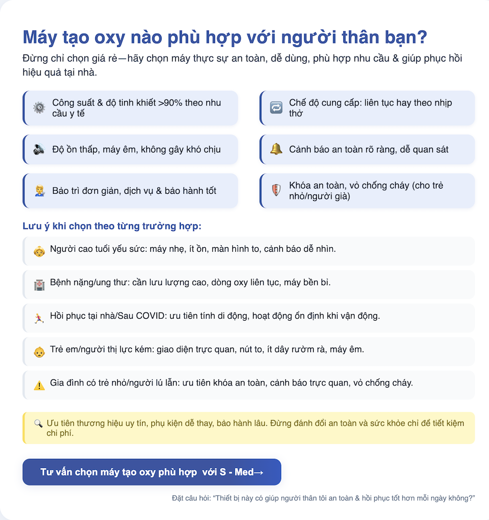 Máy tạo oxy phù hợp nhất là thiết bị đảm bảo đủ lưu lượng và độ tinh khiết oxy (>90%) theo đúng nhu cầu y tế của người sử dụng, đồng thời an toàn, dễ dùng và đáng tin cậy cho môi trường gia đình.