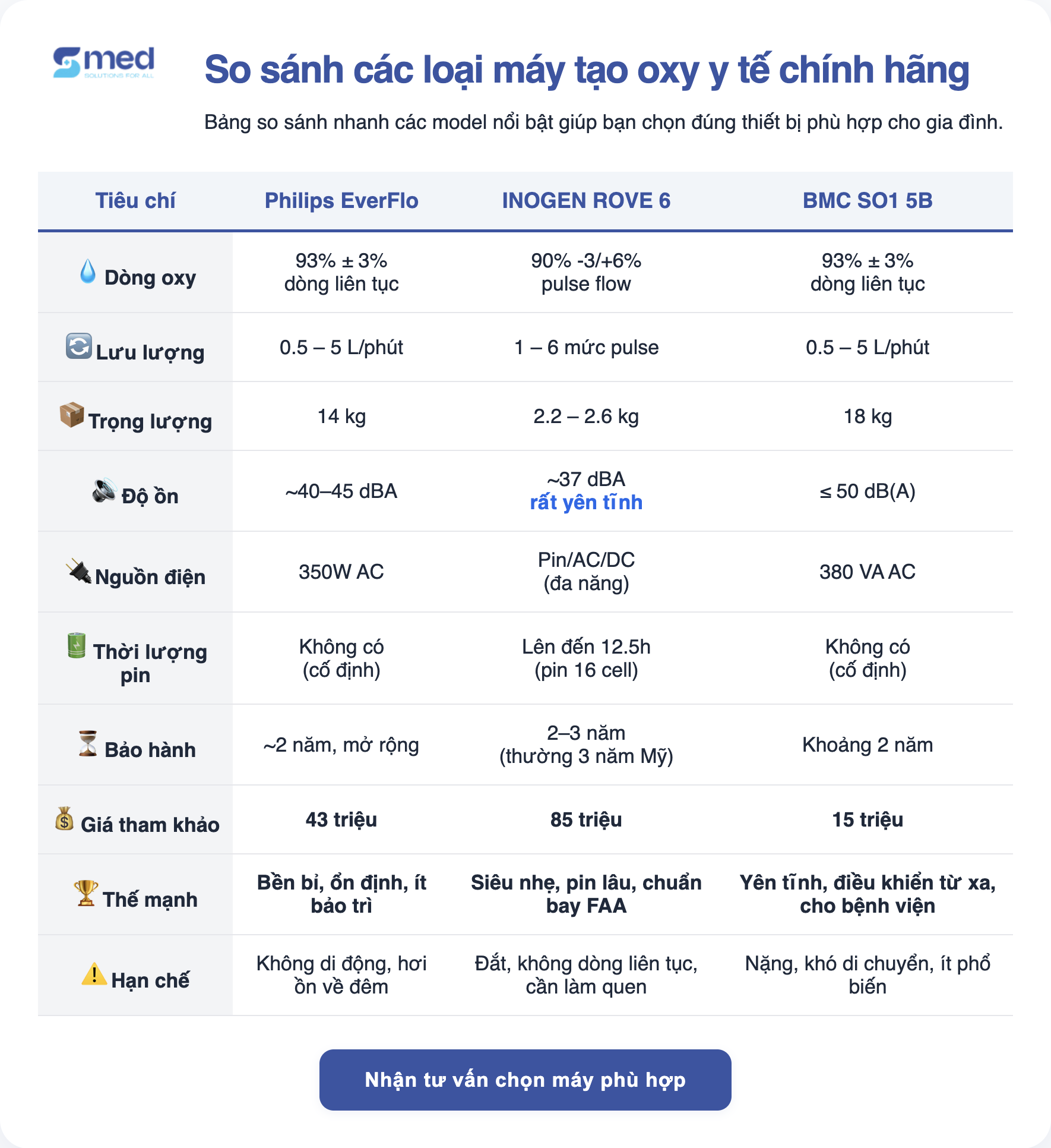 Thế mạnh | Bền bỉ, ít bảo trì, oxy liên tục ổn định | Cực kỳ nhẹ, siêu di động, pin lâu, chuẩn bay FAA | Dòng liên tục yên tĩnh, điều khiển từ xa, dùng cho bệnh viện |