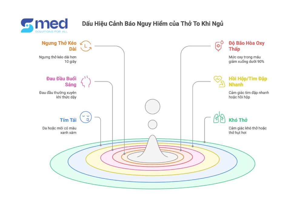 Thở to khi ngủ có thể là dấu hiệu của rối loạn hô hấp nguy hiểm nếu đi kèm với các triệu chứng như ngưng thở >10 giây, tím tái, đau đầu buổi sáng hoặc hồi hộp tim đập nhanh. Những triệu chứng này không chỉ là phiền toái – chúng có thể báo hiệu thiếu oxy trầm trọng, rối loạn nhịp tim, hoặc nguy cơ cao về tai biến tim mạch và thần kinh.
