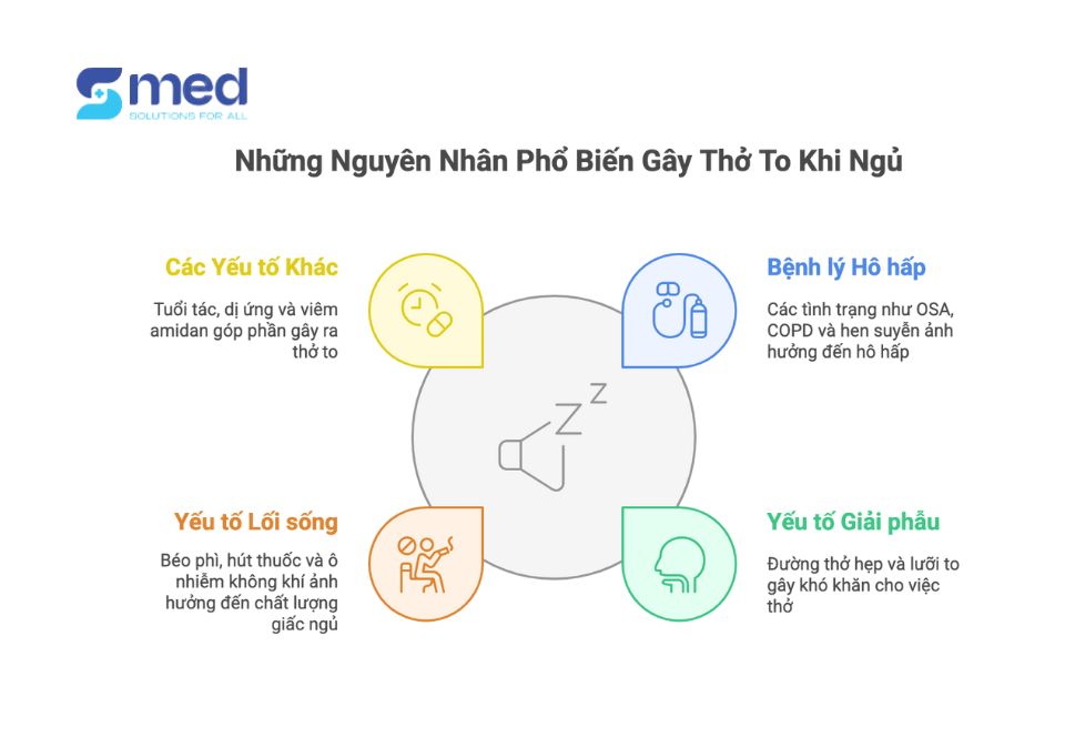 Nguyên nhân phổ biến gây thở to khi ngủ thường bắt nguồn từ ba bệnh lý hô hấp chính: ngưng thở khi ngủ (OSA), bệnh phổi tắc nghẽn mạn tính (COPD) và hen suyễn. Những nguyên nhân này chiếm tỷ lệ cao tại Việt Nam, đặc biệt ở nam giới lớn tuổi, người béo phì, hoặc sống tại đô thị nhiều khói bụi.