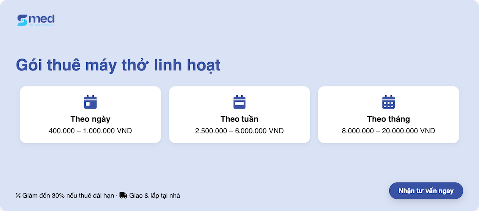 Ngoài ra, dịch vụ cho thuê còn cung cấp các phụ kiện như mặt nạ thở (10.000 – 100.000 VND) và bộ tạo ẩm (100.000 – 300.000 VND) để tối ưu hóa trải nghiệm sử dụng. Giảm giá đặc biệt dành cho thuê dài hạn: giảm từ 5-15% cho 3 tháng, và lên đến 30% cho thuê hàng năm – đây là lựa chọn kinh tế cho những bệnh nhân cần hỗ trợ lâu dài.