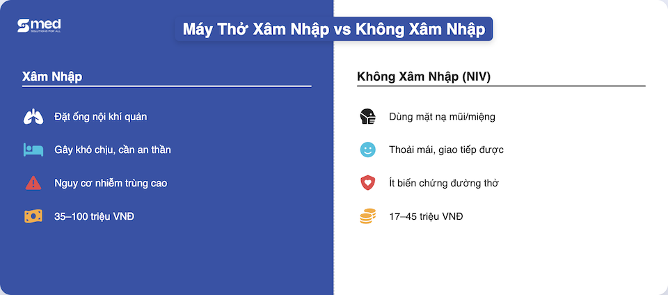 Tính năng | Máy thở xâm nhập | Máy thở không xâm nhập |