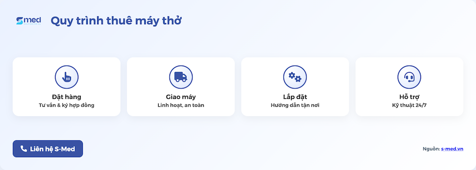 Quy trình thuê máy thở tại nhà của chúng tôi được thiết kế đơn giản, tiện lợi, nhằm mang đến sự hỗ trợ hô hấp an toàn và nhanh chóng cho bệnh nhân. Dưới đây là các bước cụ thể để bạn dễ dàng tiếp cận dịch vụ: