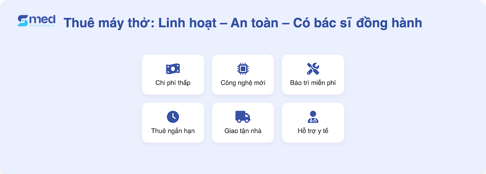 Thuê máy thở mang lại nhiều lợi ích thiết thực về tài chính, y tế và sự linh hoạt. Thay vì đối mặt với chi phí lớn khi mua máy, dịch vụ thuê máy thở giúp giảm đáng kể gánh nặng tài chính ban đầu.