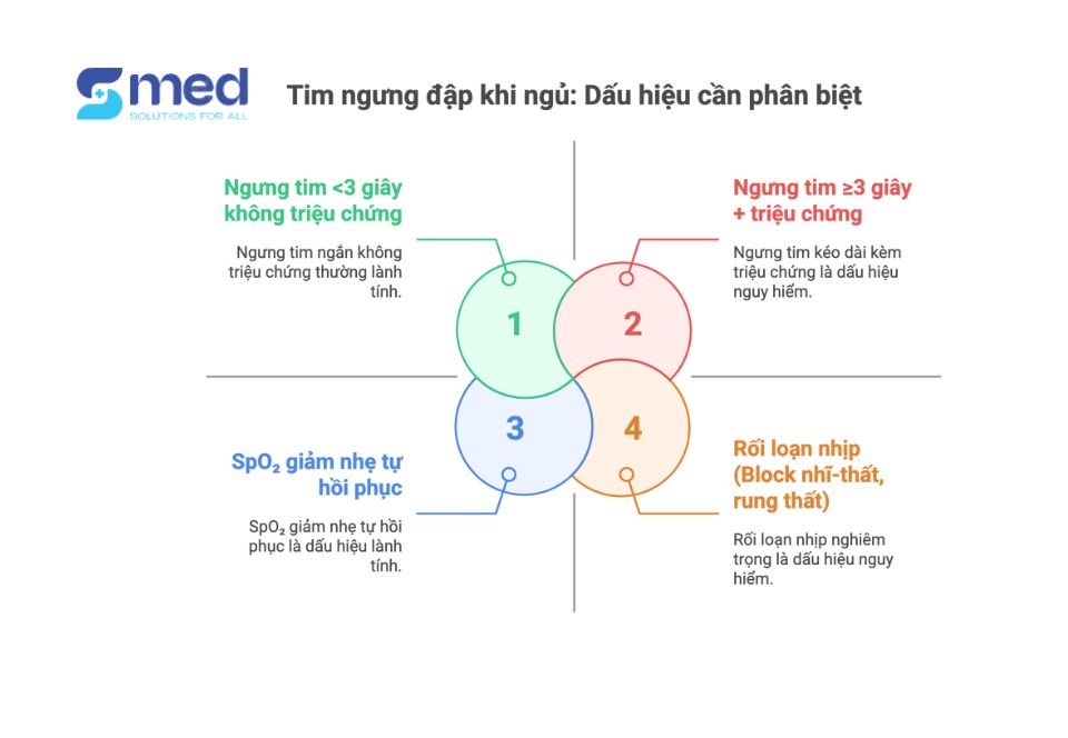 Không nên nhầm lẫn giữa ngưng tim thực sự và hiện tượng tim đập chậm sinh lý khi ngủ. Trường hợp nghiêm trọng thường liên quan đến rối loạn nhịp tim do ngưng thở khi ngủ (OSA), gây thiếu oxy máu ban đêm, từ đó kích hoạt chuỗi phản xạ thần kinh nguy hiểm dẫn tới asystole ≥3 giây, SpO₂ <78%, hoặc rối loạn nhịp thất. Đây là các ngưỡng lâm sàng cần lưu ý: