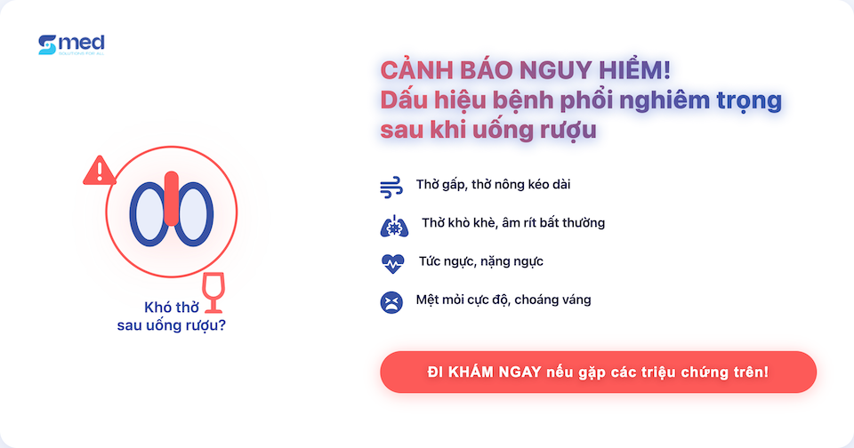 Uống rượu vào bị khó thở có thể là dấu hiệu của các vấn đề hô hấp nghiêm trọng, từ viêm đường thở tạm thời đến bệnh phổi tắc nghẽn mạn tính (COPD) hoặc hội chứng suy hô hấp cấp tính (ARDS).
