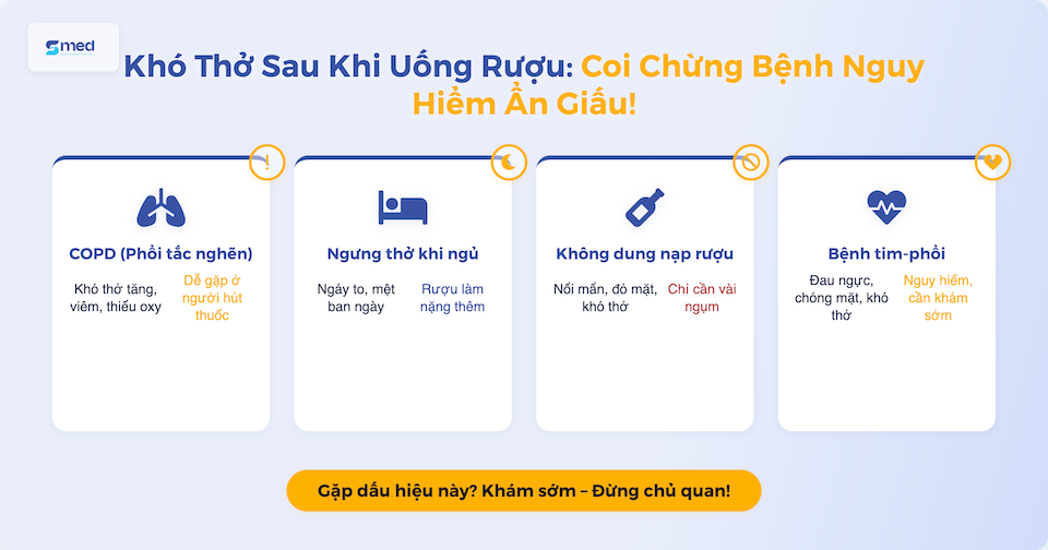Uống rượu vào khó thở có thể là dấu hiệu cảnh báo của nhiều bệnh lý nghiêm trọng, bao gồm COPD, ngưng thở khi ngủ, không dung nạp rượu và hội chứng tim-phổi. Việc xác định nguyên nhân chính xác sẽ giúp bạn chủ động điều trị sớm và tránh biến chứng nguy hiểm.